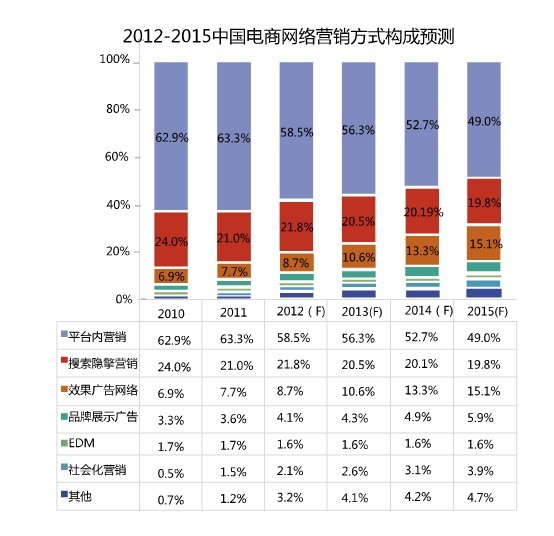 隨著中國互聯網媒體的逐漸豐富,電商網絡營銷的渠道也越來越多樣化,除在電商平臺內進行營銷推廣外,搜索引擎、效果廣告網絡、品牌展示、EDM、社會化媒體、網址導航、搜索及比價等網絡媒體平臺都成為電商在進行網絡營銷的重要布局。 預計2015年中國電商網絡營銷市場規模將達到488.7億元,而隨著電商,尤其是品牌電商進行全網營銷的意識不斷增強,電商在平臺外營銷投入比重將逐漸提升,平臺內營銷投放比重將由2011年的63.3%降至49.0%,電商在搜索引擎的營銷投入比重將保持穩定的態勢,2015年份額為19.8%。隨著廣告精準性的提升,電商在效果廣告網絡和品牌展示廣告的投放規模將分別由7.7%和3.6%增長至15.1%和5.9%。