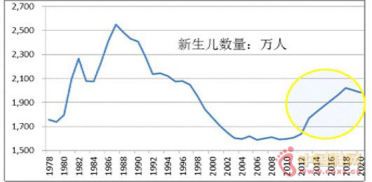 根據(jù)統(tǒng)計(jì)數(shù)據(jù)分析,由于上世紀(jì)80年代生育高峰的自然循環(huán),絕大多數(shù)80后將陸續(xù)結(jié)婚生子,這將使中國(guó)大陸在2015年前后迎來一次嬰兒潮,預(yù)計(jì)這一輪嬰兒潮的時(shí)間長(zhǎng)度有望維持到2020年左右。中國(guó)新生人口數(shù)量有望從當(dāng)前的每年1600萬上升到每年2000萬(峰值)的水平,穩(wěn)定狀態(tài)可能維持每年1800-1900萬左右。