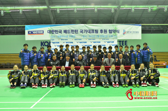 【中國鞋網-品牌動態】2013年2月22日,威克多(專賣店)VICTOR與世界羽球頂級強隊——韓國隊,在韓國國家訓練中心完成續約儀式。這支由李龍大、高成炫、成池鉉等著名球星領軍的羽壇勁旅將繼續身披VICTOR戰袍和全新裝備征戰各大國際賽事。