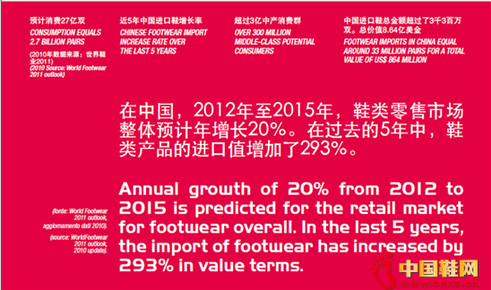 中國(guó)有超過(guò)3億的中產(chǎn)消費(fèi)群,2012年至2015年,鞋類零售市場(chǎng)整體預(yù)計(jì)增長(zhǎng)20%,預(yù)計(jì)消費(fèi)27億雙,中國(guó)進(jìn)口鞋總金額超過(guò)了3千3百萬(wàn)雙,總價(jià)值8.64億美金。在過(guò)去5年中,鞋類產(chǎn)品的進(jìn)口增加了293%?梢(jiàn)中國(guó)鞋業(yè)市場(chǎng)規(guī)模的潛力巨大。