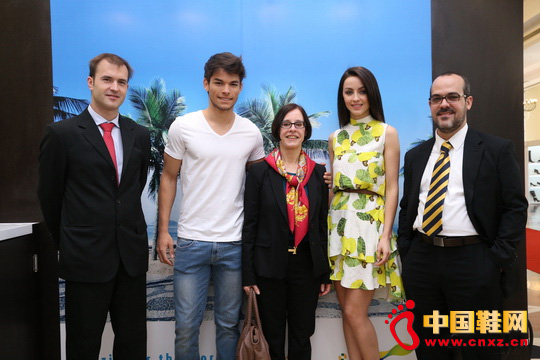 巴西駐滬總領事安娜女士(中)與國際名模、前巴西小姐Ariane Colombo(右2)、巴西鞋業協會國際項目總監Cristiano Korbes先生在展臺合影