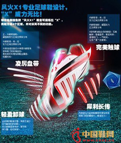 此次特步推出大學(xué)生足球聯(lián)賽的專屬足球鞋——風(fēng)火X1。該款足球鞋設(shè)計(jì)獨(dú)特,獨(dú)有特步X型結(jié)構(gòu),將足球鞋分成4大個(gè)功能區(qū)域,具有完美觸球、凌厲盤帶、犀利長傳、輕盈卸球四大特點(diǎn),使得球鞋更加貼合腳型,一氣呵成,“掌”控激情。