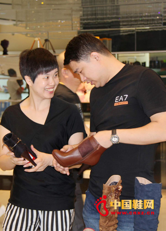 江蘇客商李海兵(右)對印心鳥秋冬鞋愛不釋手